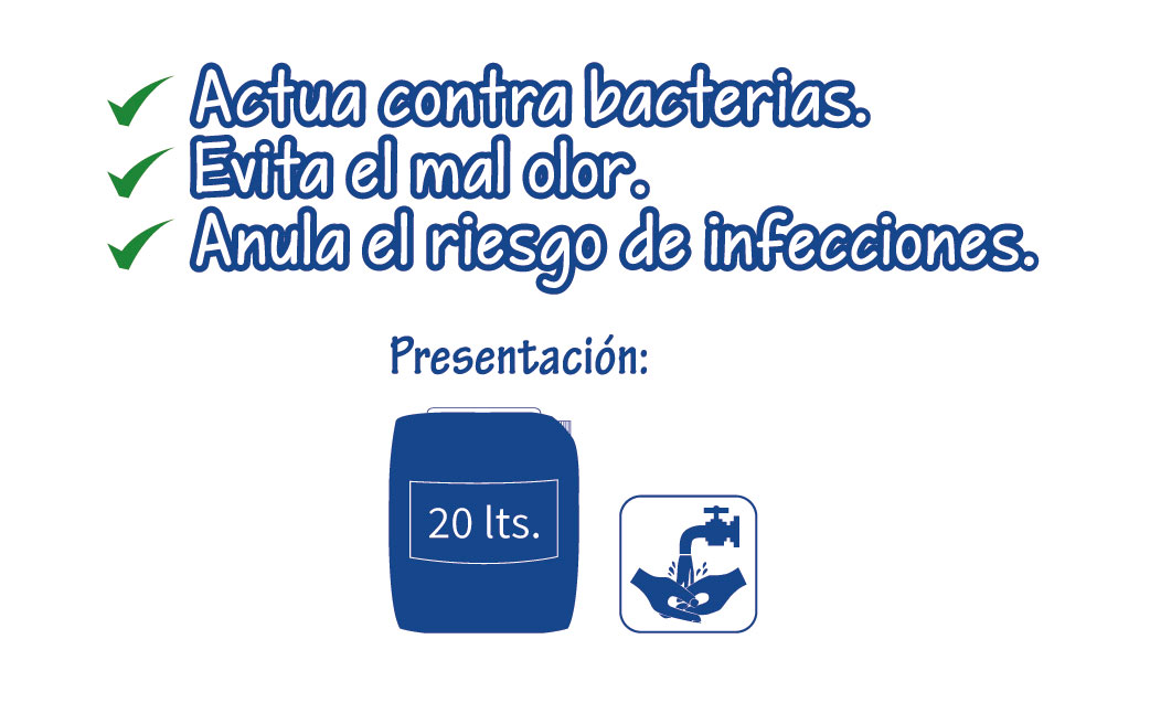 Es un jabón líquido con poder antibacterial formulado para lavar y sanitizar las manos del personal en áreas de producción de la industria de bebidas y alimentos, para colocarse y usarse en comedores, baños y en áreas donde se necesite el lavado y sanitizado de manos.